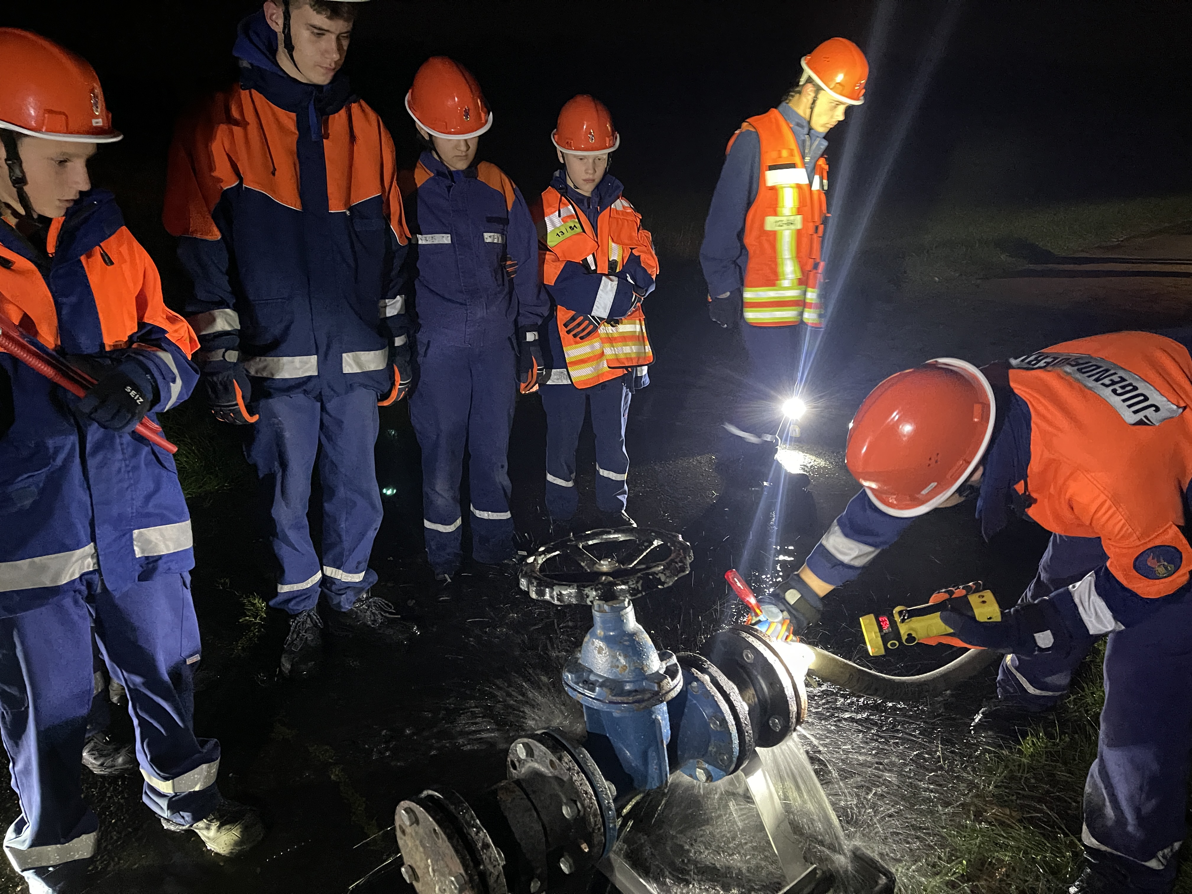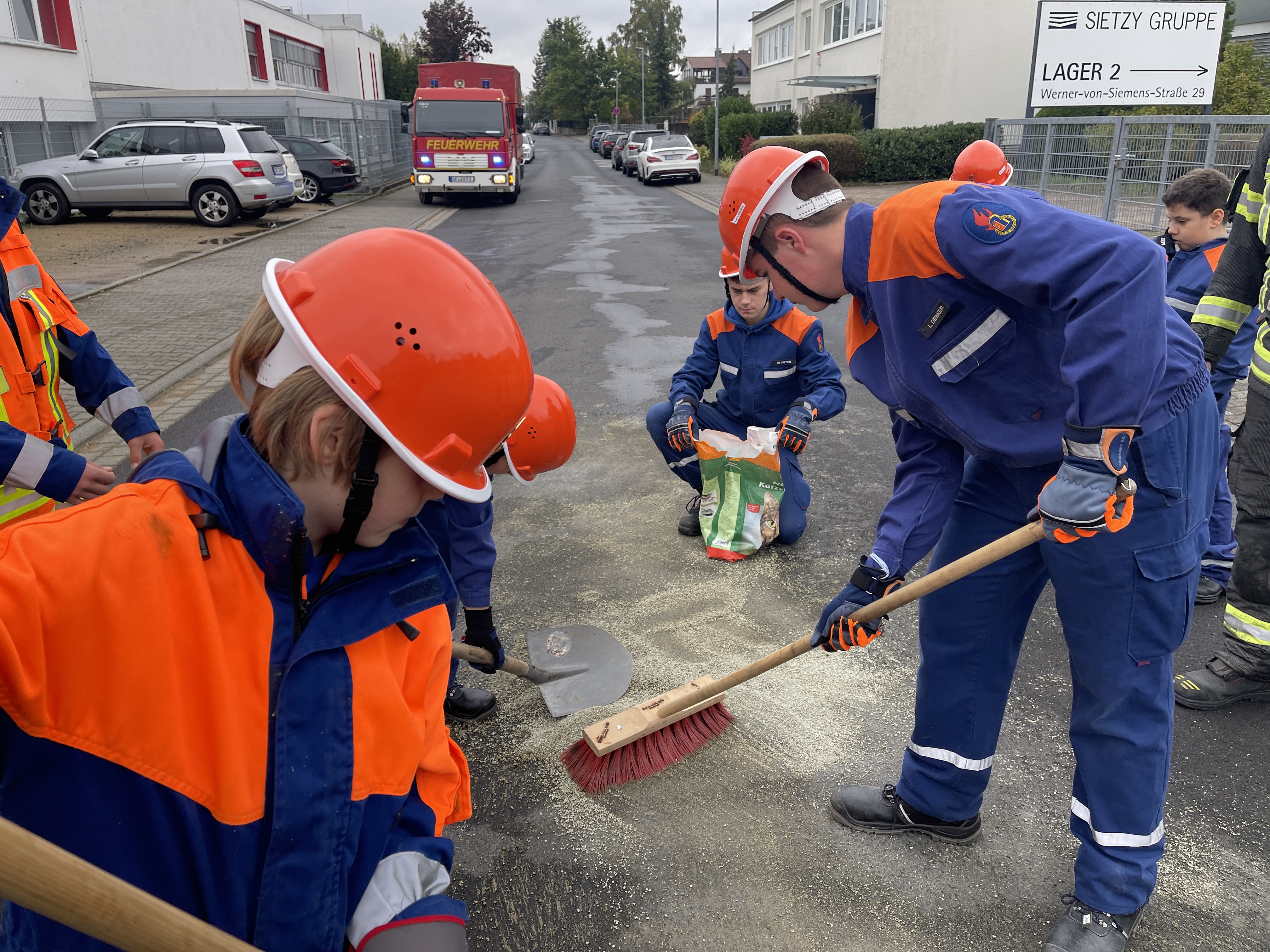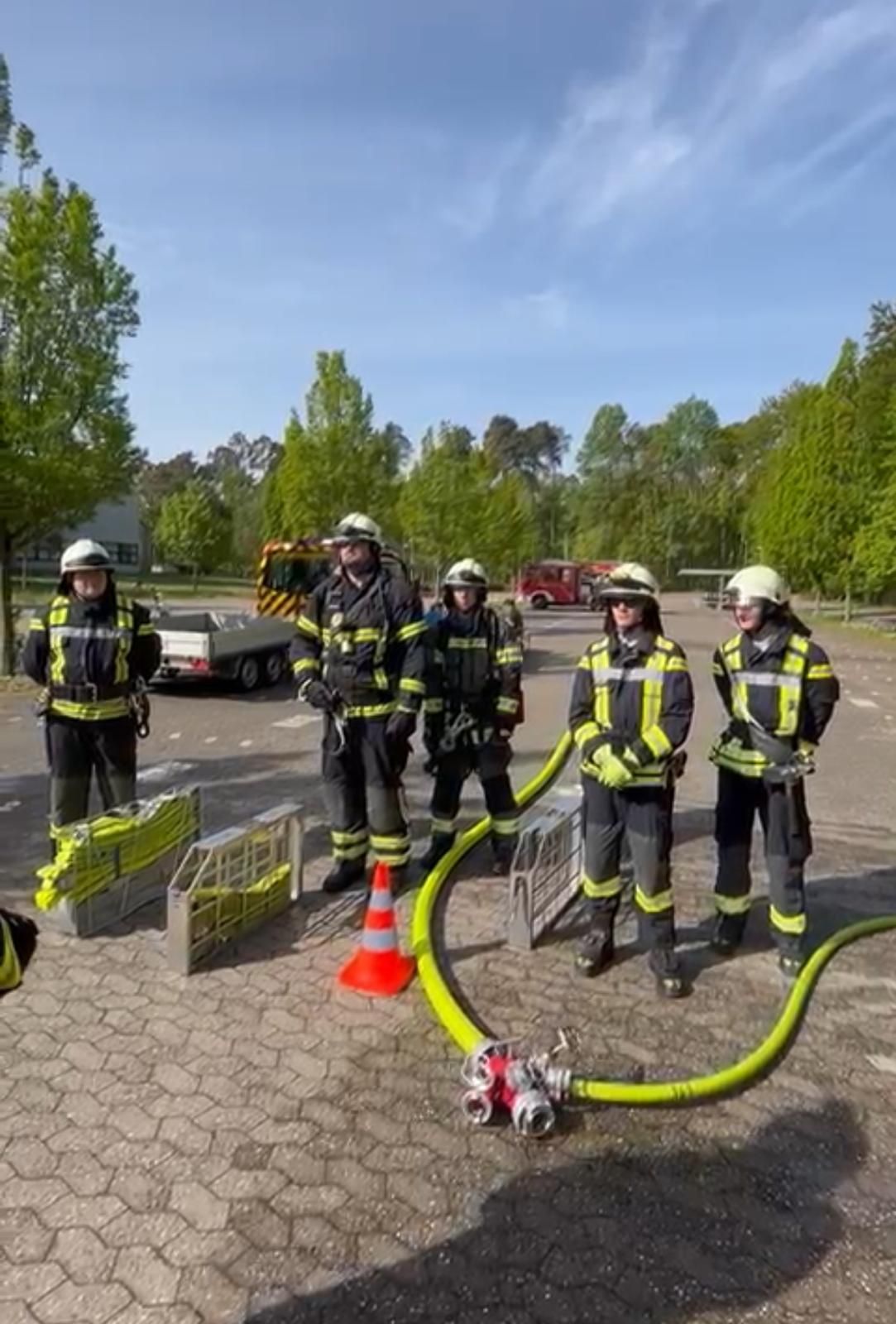Kaum war der Dienst offiziell gestartet, ging es auch schon los: Ein „Katze auf Baum“-Einsatz (natürlich ein Kuscheltier) verlangte Fingerspitzengefühl und Teamarbeit. Es folgten zahlreiche weitere Szenarien, die von den Jugendlichen mit großem Engagement und wachsender Routine abgearbeitet wurden – darunter ein Flächenbrand, ein PKW-Brand, eine unter einem Auto eingeklemmte Person sowie zwei Mülltonnenbrände. Auch eine dringende Türöffnung, ein Wasserrohrbruch, eine Tragehilfe für den Rettungsdienst, eine Personensuche morgens um 6:00 Uhr eine Personen und schließlich ein aufwendig inszenierter Lagerhallenbrand standen auf dem Programm.