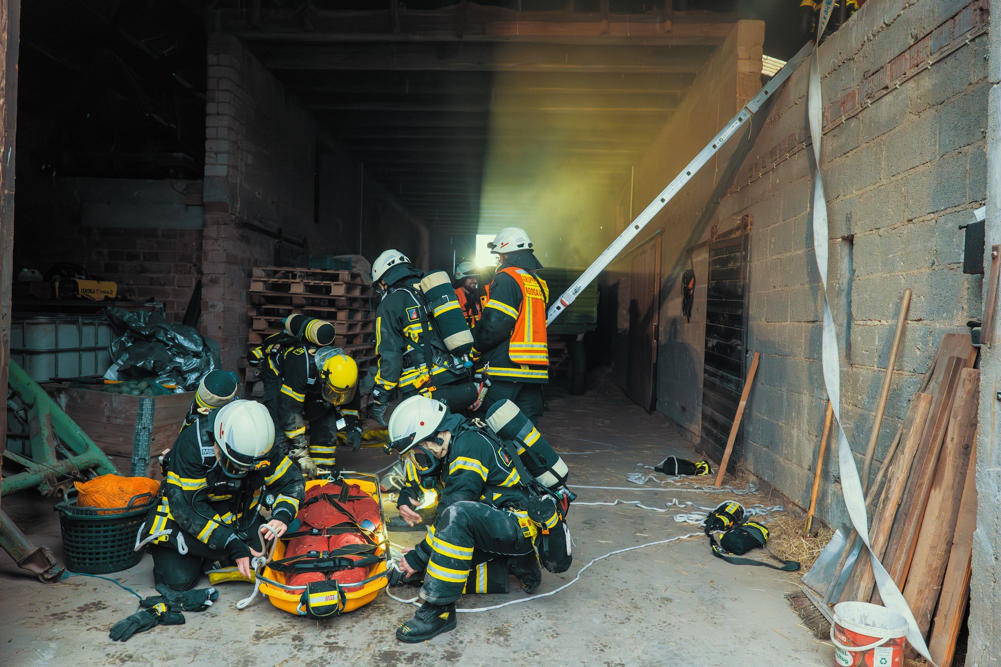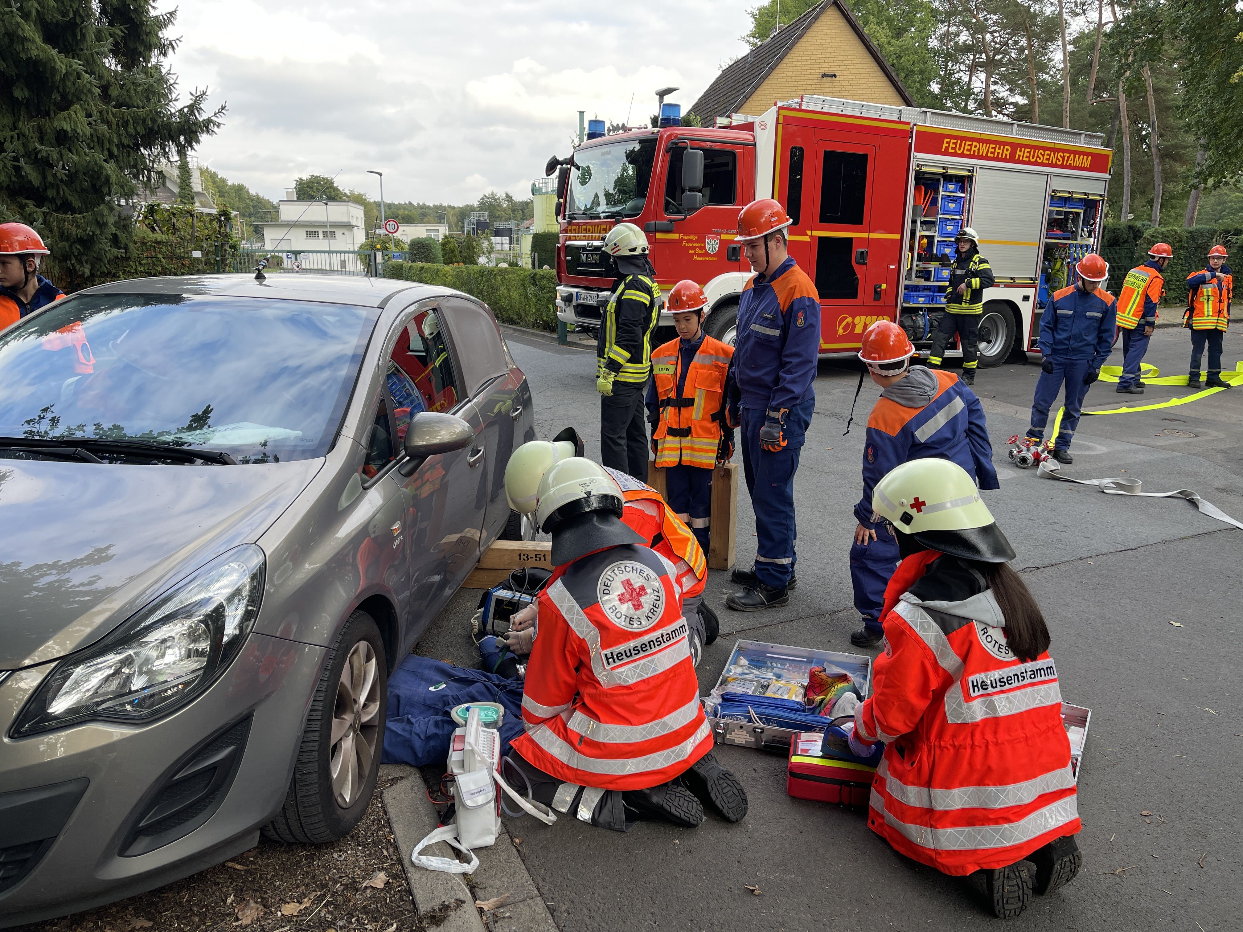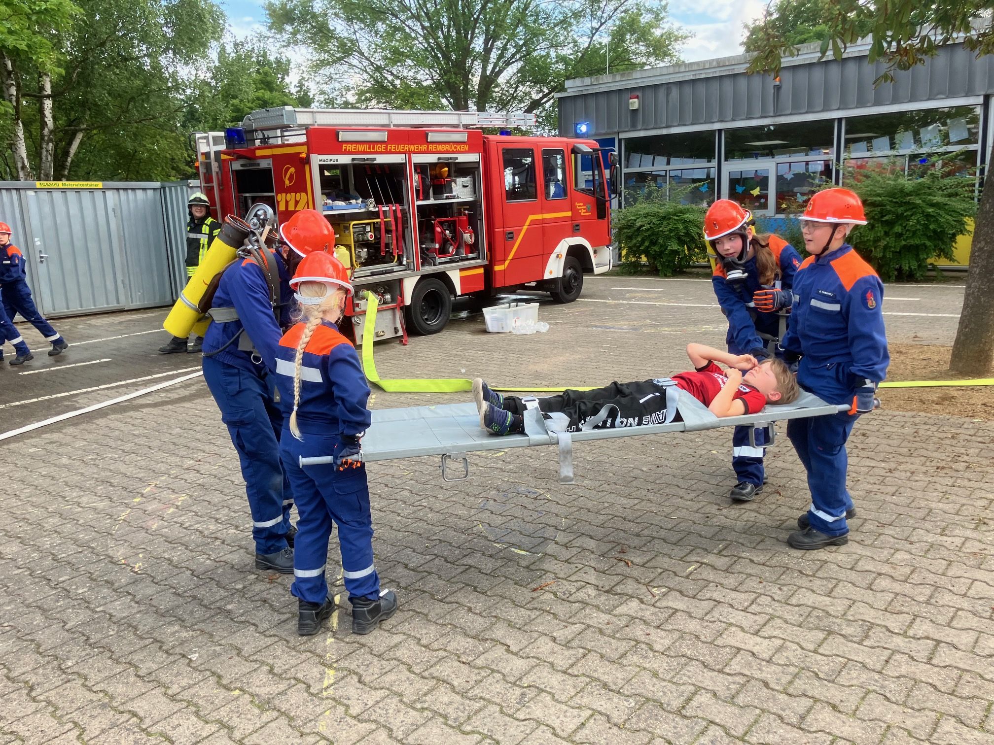 Kaum war der Dienst offiziell gestartet, ging es auch schon los: Ein „Katze auf Baum“-Einsatz (natürlich ein Kuscheltier) verlangte Fingerspitzengefühl und Teamarbeit. Es folgten zahlreiche weitere Szenarien, die von den Jugendlichen mit großem Engagement und wachsender Routine abgearbeitet wurden – darunter ein Flächenbrand, ein PKW-Brand, eine unter einem Auto eingeklemmte Person sowie zwei Mülltonnenbrände. Auch eine dringende Türöffnung, ein Wasserrohrbruch, eine Tragehilfe für den Rettungsdienst, eine Personensuche morgens um 6:00 Uhr eine Personen und schließlich ein aufwendig inszenierter Lagerhallenbrand standen auf dem Programm.