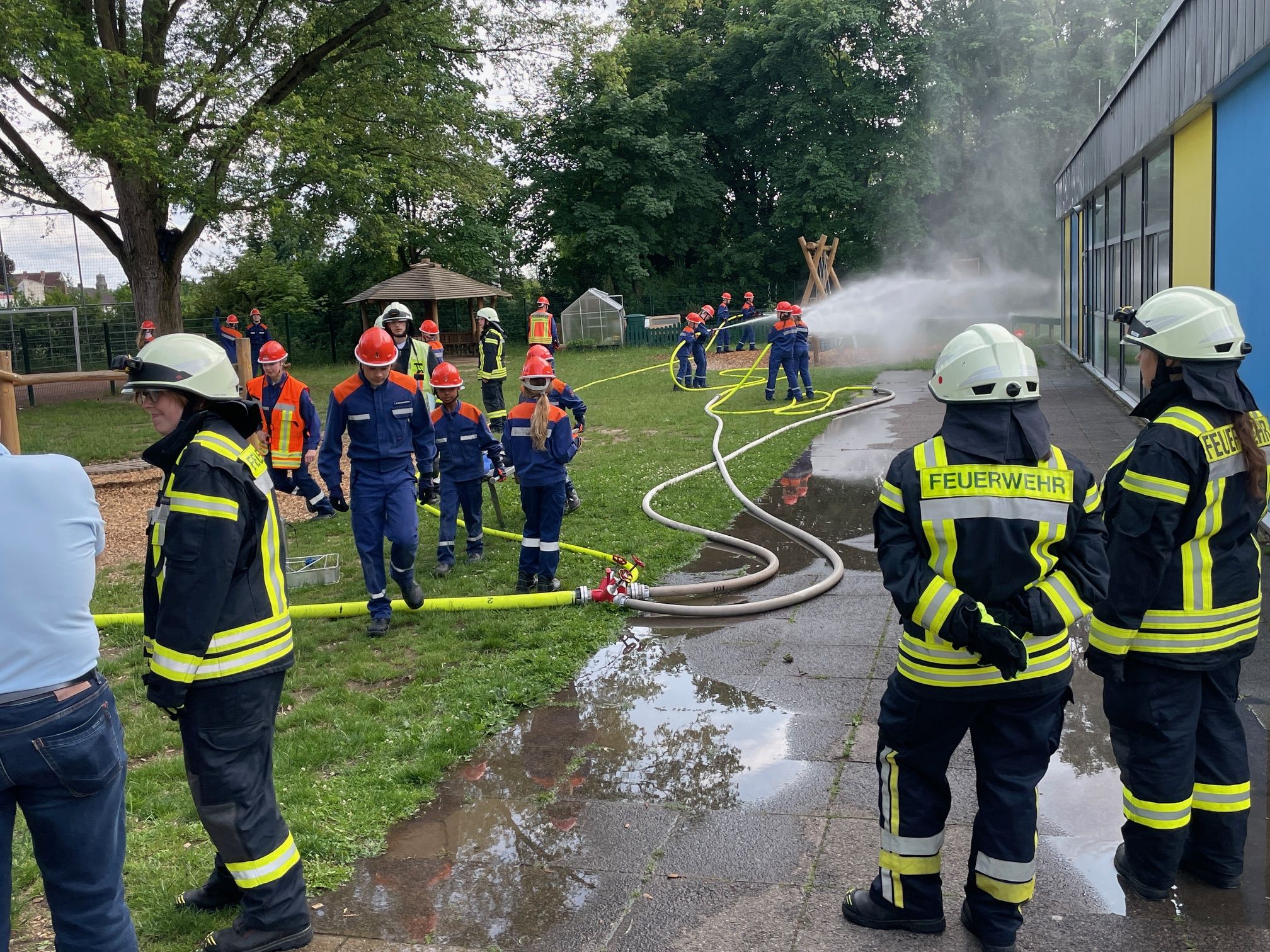 Für den Einsatz wurden zahlreiche Feuerwehrfahrzeuge in Stellung gebracht, darunter drei Löschfahrzeuge, ein Rüstwagen, zwei Mannschaftstransportfahrzeuge und als besonderes Highlight: die Drehleiter, welche ebenfalls einen Löschangriff aus mehreren Metern Höhe durchgeführt hat und damit ein spektakuläres Ereignis für die Jugendlichen und Zuschauer wurde. Die Jugendlichen wurden in drei Einsatzabschnitte eingeteilt, um den Einsatz professionell abzuarbeiten: