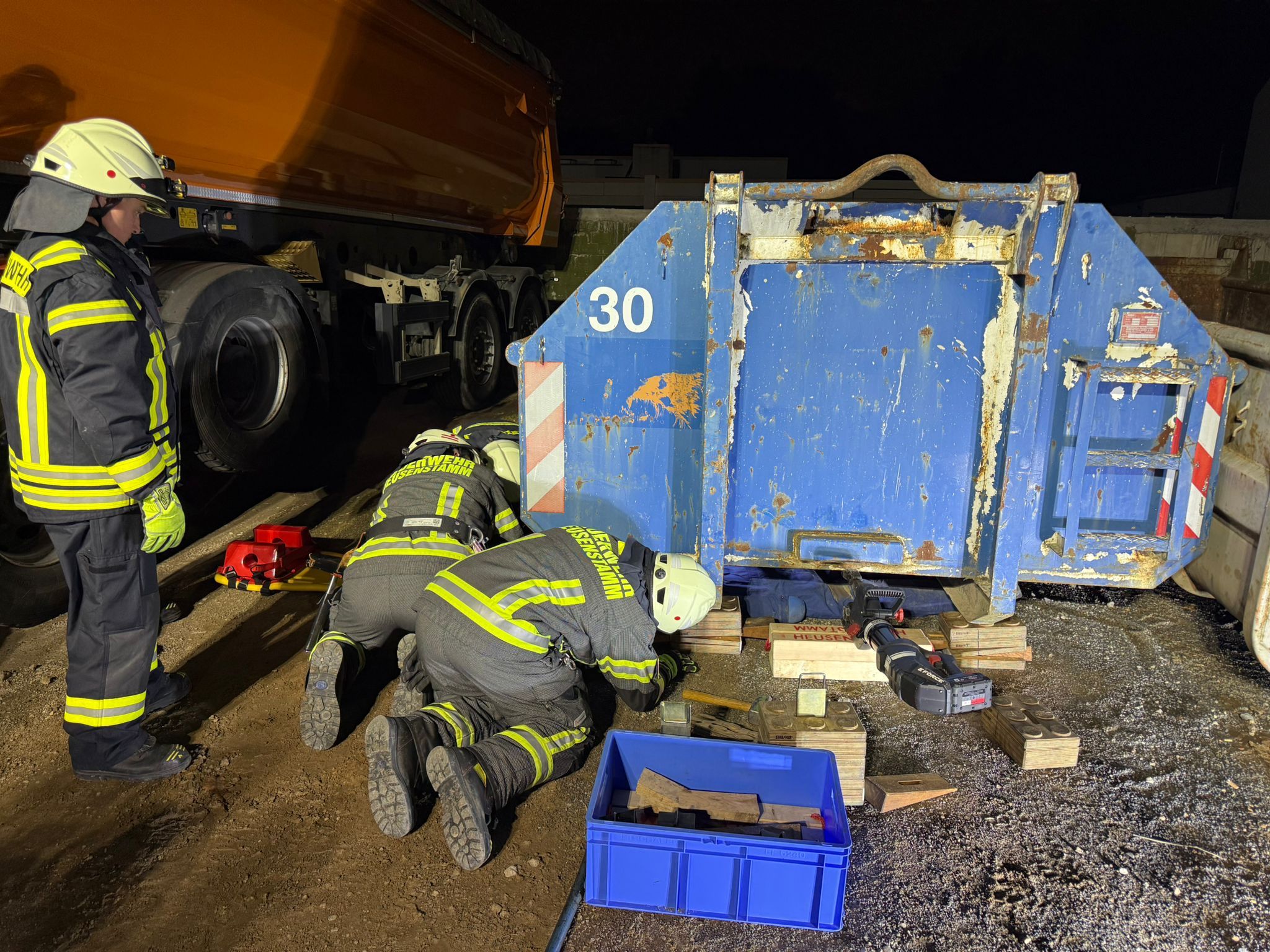 Befreiung von Übungspuppen unter Containern, Betonteilen und eine Rettung aus einem Schacht. Hierzu wurde das umfangreiche Rettungsgerät des Staffel-Löschfahrzeugs verwendet, da dieses Fahrzeug mit sechs Feuerwehrkräften besetzt als erstes zu Hilfeleistungseinsätzen im Stadtgebiet ausrückt. Ebenso wurde als Abschluss dieser Gruppenausbildung ein Container an das Fahrzeug angeschlagen und durch Ziehen von einem anderen Container weg bewegt.
