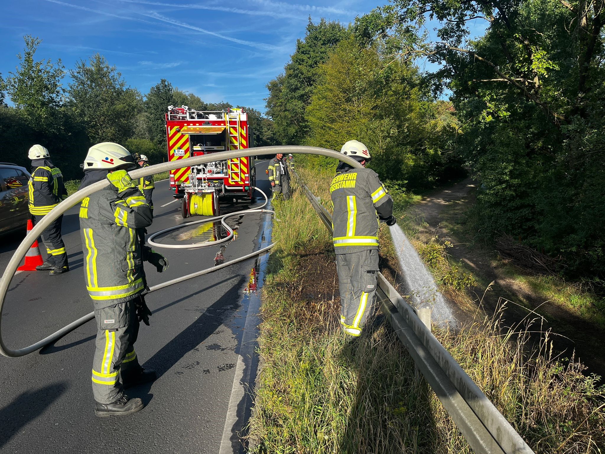 Am Montag, den 18. August kam es zu drei Einsätzen im Laufe des Nachmittags. Um 12:25 Uhr wurde ein Verkehrsunfall mit möglicherweise eingeklemmter Person in der Straße Am Frankfurter Weg gemeldet. Beim Eintreffen des Rüstzugs konnte ein Fahrzeug zwischen Gestrüpp und Bäumen vorgefunden werden. Eine Person befand sich außerhalb des Fahrzeugs und war glücklicherweise unverletzt. Nach kurzen Sicherungs- und Absperrmaßnahmen konnte die Einsatzstelle verlassen und an die Polizei übergeben werden.