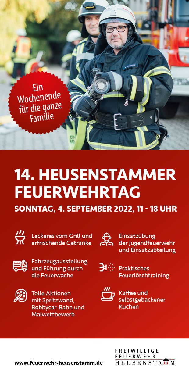 Am Wochenende vom 3. und 4. September 2022 präsentiert sich die Feuerwehr Heusenstamm zu ihrem Tag der offenen Tür. Am Samstag, 3. September ab 18 Uhr lädt der Förderverein zur Beach-Sommer-Party ein. Mit kühlen Drinks von der Cocktailbar, Leckeres vom Grill, Musik und einem Spieleparcour für Jung und Alt startet das Wochenende. Am Sonntag, 4. September, von 11 bis 18 Uhr präsentiert sich die Feuerwehr mit Schauübungen der Einsatzabteilung, der Jugend- und der Kinderfeuerwehr. Für Kinder wird eine Mal- und Bastelecke mit Malwettbewerb, sowie wie eine Bobbycar-Bahn, Spritzwand und vieles mehr angeboten. Für Speisen und Getränke ist an beiden Tagen bestens gesorgt, inkl. Kuchentheke ab Sonntagmittag.