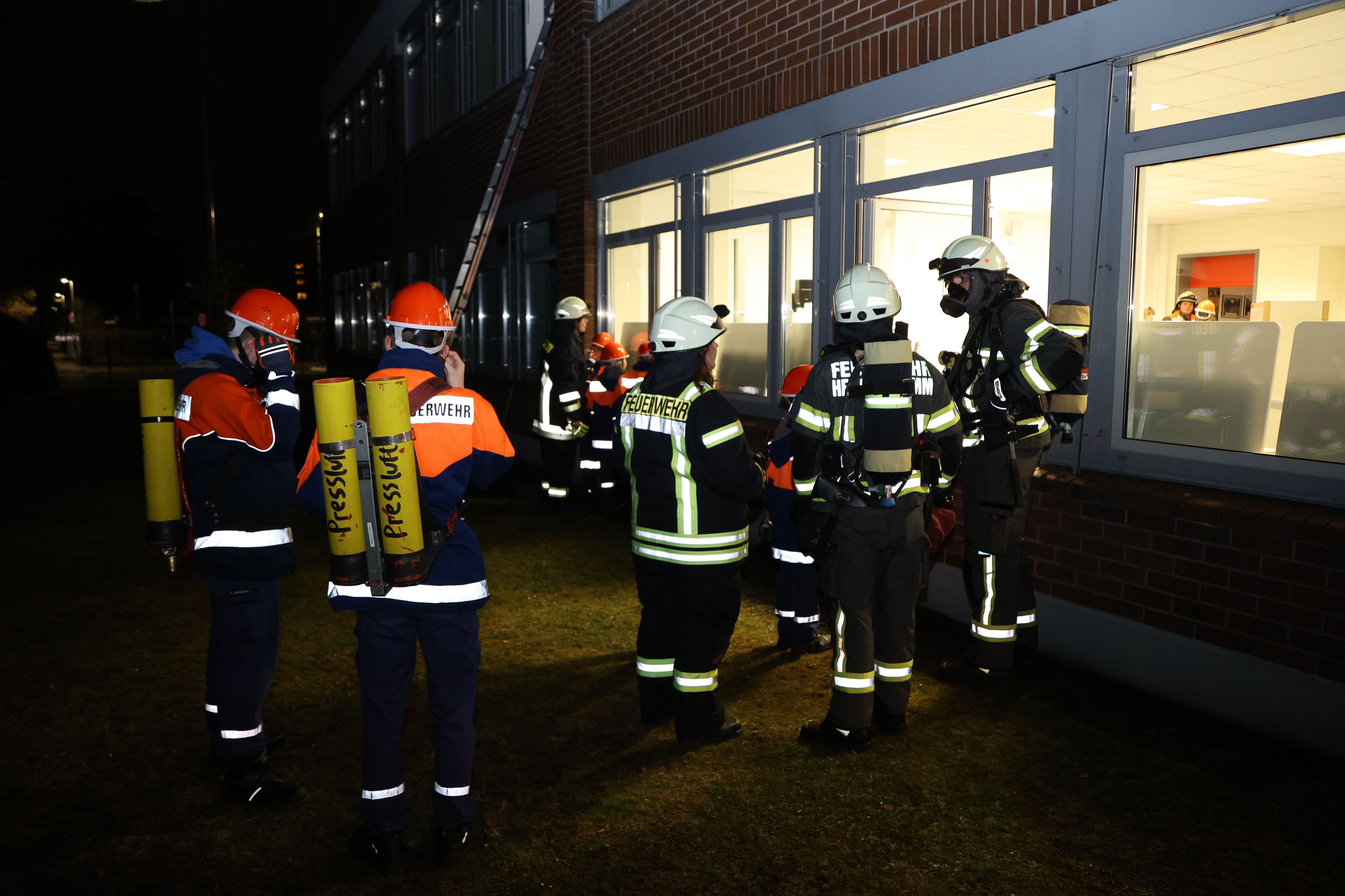Das Szenario: Ein Wiesenbrand auf dem Schulgelände greift auf das Schulgebäude über. Mehrere Personen gelten als vermisst, darunter drei Übungspuppen sowie eine gesamte Schulklasse, die sich noch im Gebäude befindet. Auch mehrere Gefahrenstoffe müssen aus dem Werkraum gebracht werden, um schlimmeres zu verhindern.