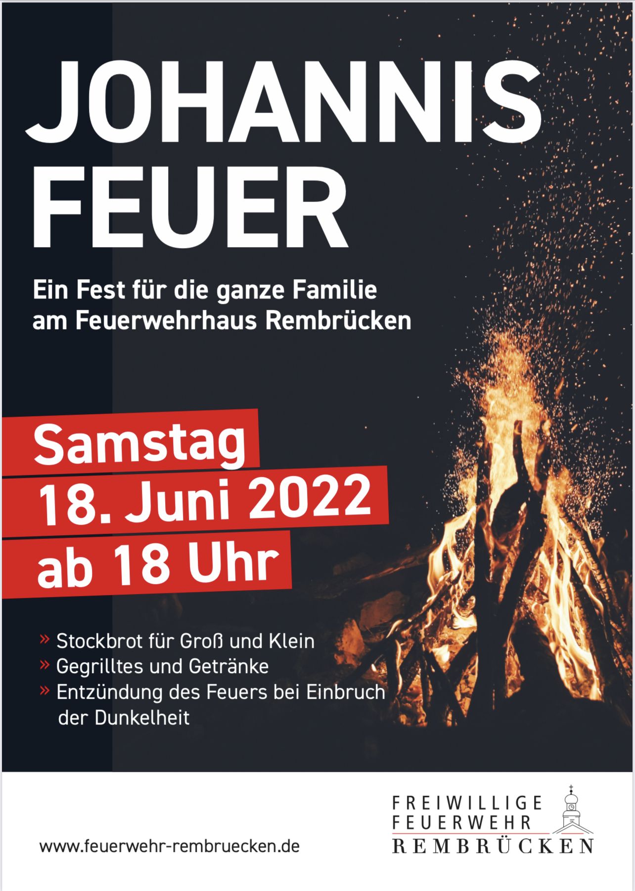 Nach zwei langen Jahren des Wartens war es am Samstag, den 18. Juni 2022 wieder so weit, das traditionelle Johannisfeuer der Feuerwehr Rembrücken konnte endlich wieder stattfinden. Bei herrlichstem Sommerwetter fanden sich im Laufe des Abends rund 400 Besucher im Park hinter dem Feuerwehrhaus ein, um mit den Brandschützern den längsten Tag des Jahres gebührend zu feiern und das ca. 3 Meter hohe Sonnwendfeuer zu bestaunen.