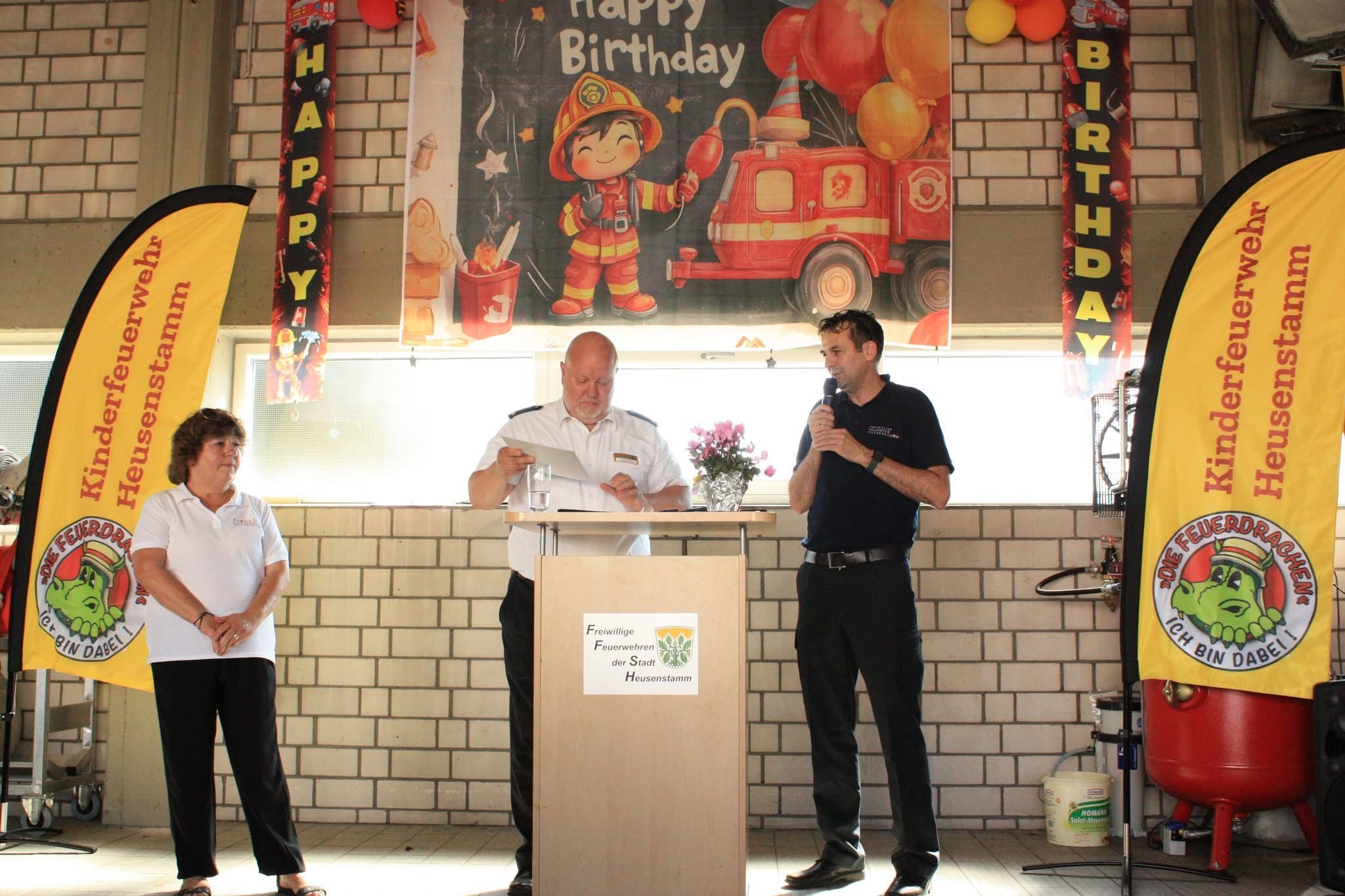 Zu den Gratulanten zählten Bürgermeister Steffen Ball, Kreisjugendfeuerwehrwart Oliver Meyer, Vertreter der Stadtbrandinspektion, der Wehrführung und des Fördervereins der Freiwilligen Feuerwehr Heusenstamm. Auch die Vertreter von Kinder- und Jugendfeuerwehren aus dem Kreis Offenbach überbrachten herzliche Glückwünsche und Präsente.