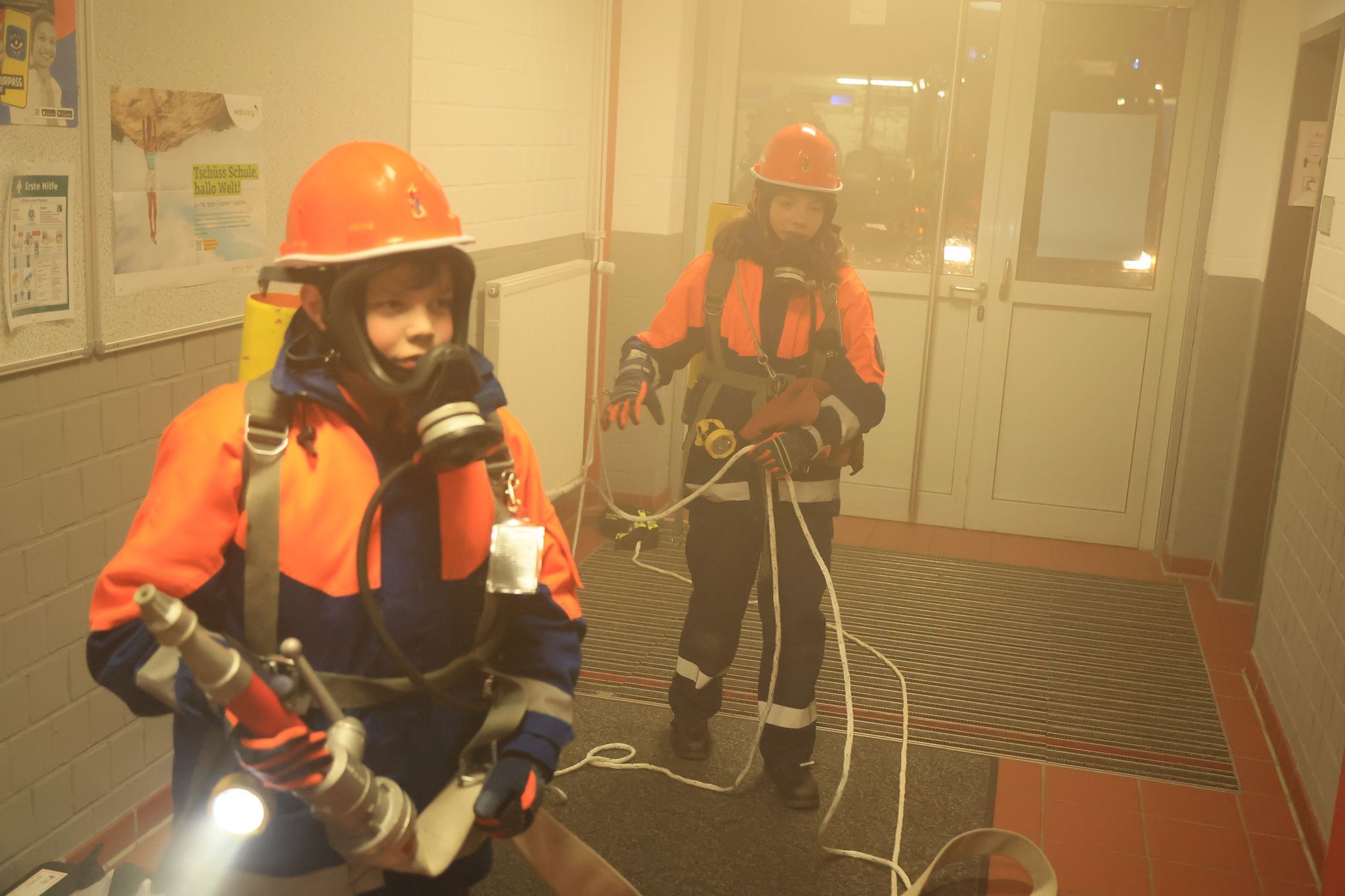 2. Innenangriff: In diesem Abschnitt drangen die Jugendlichen in das Schulgebäude vor. Im Werkraum musste ein Brandherd bekämpft, Gefahrstoffe gesichert und mehrere vermisste Personen gerettet werden.