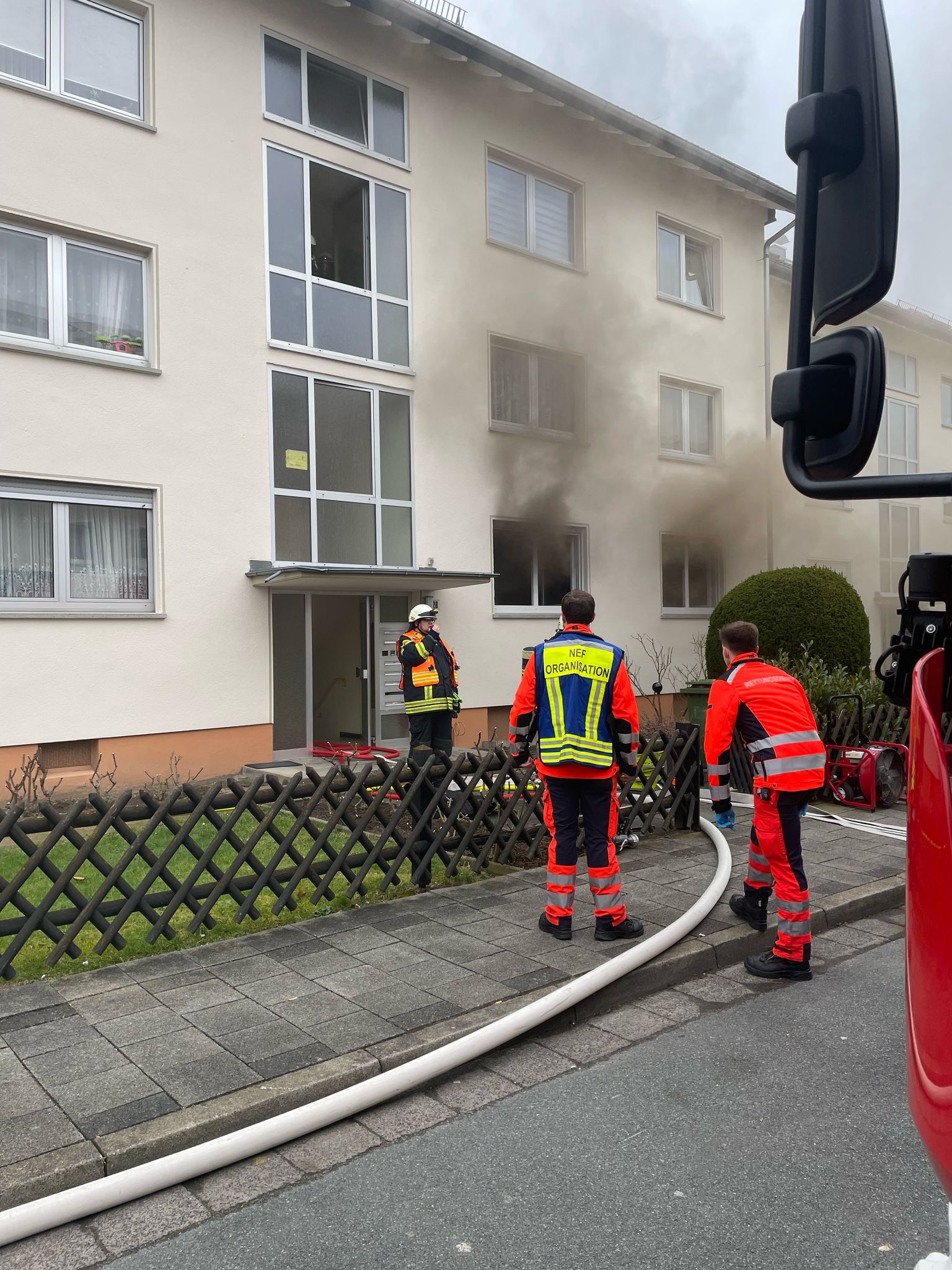 Beim Eintreffen des Einsatzleiters Mario Rebell befanden sich mehrere Bewohner vor dem Gebäude und teilten mit, dass es im Erdgeschoss eine starke Rauchentwicklung gebe. Ein Bewohner befand sich zu diesen Zeitpunkt noch in der betroffenen Wohnung. Er wurde umgehend ins Freie gebracht. Der Brand im Küchenbereich war bereits weitestgehend gelöscht.